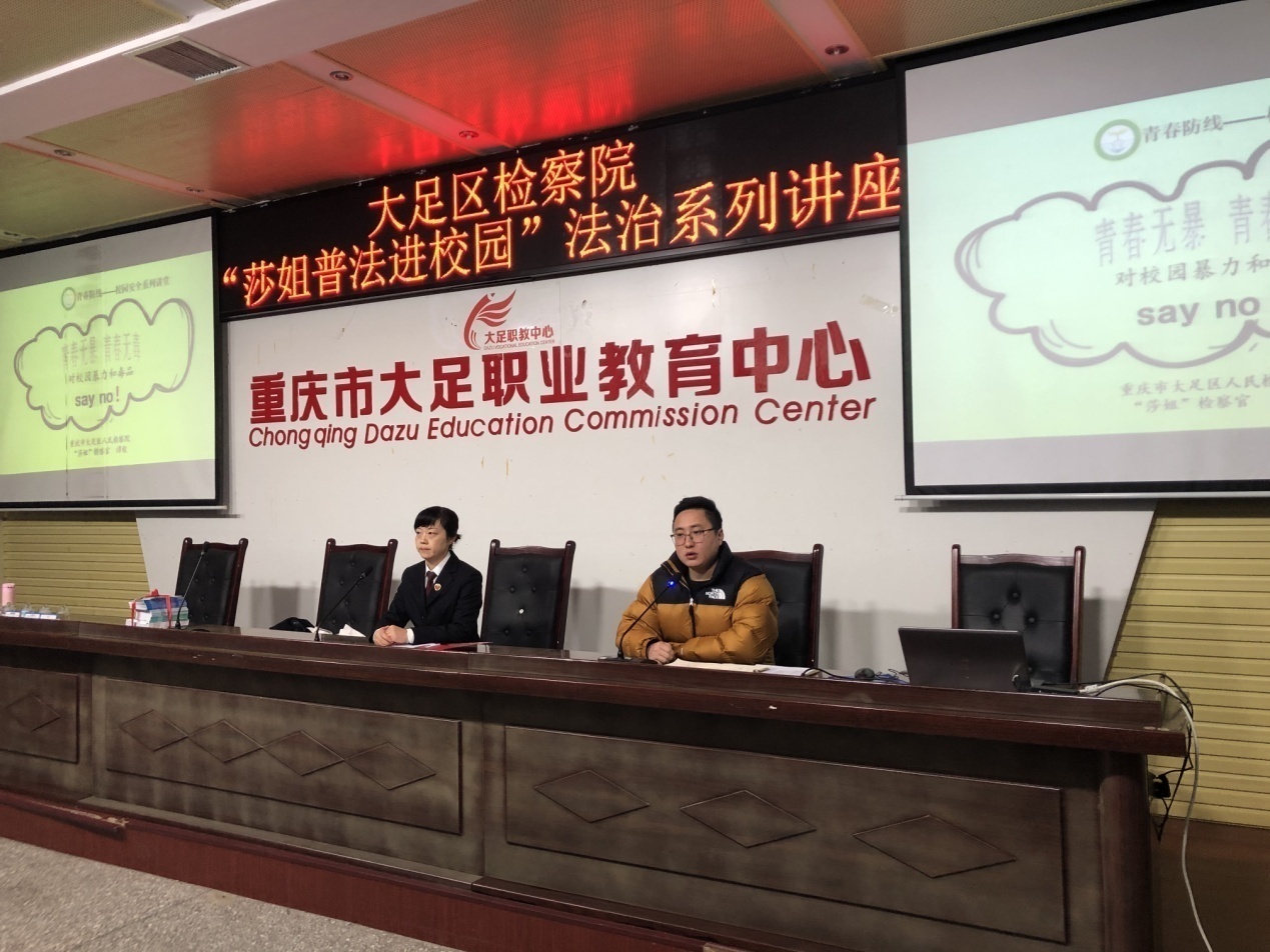 为减少校园暴力和未成年人犯罪,强化学校法治宣传教育,12月10日,大足职教中心有幸邀请到区检察院检察二部副主任、专门负责全区“未检”工作的检察官谭俊在学校第一学术报告厅作“莎姐普法进校园”法治系列讲座。讲座由职教中心安稳办副主任宋熹同志主持。各班学生代表、安稳办全体同志共计300余人全程参与了活动。