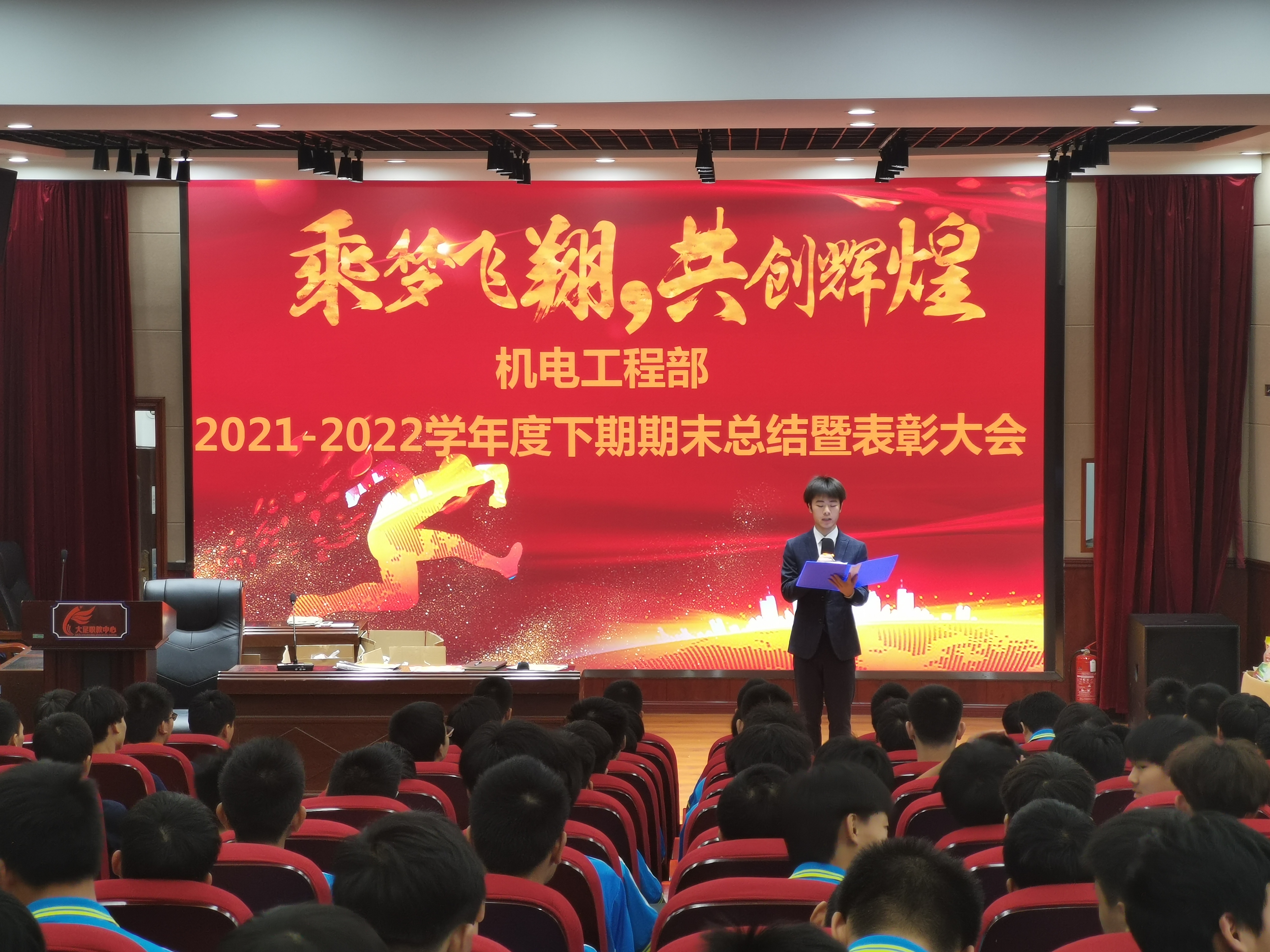 2022年6月24日,职教中心机电工程部在学校第三学术报告厅召开“乘梦飞翔 共创辉煌”期末德育表彰大会。学校学生处主任甘雨、机电工程部部长李再明出席表彰会,因疫情管控,各班受表彰学生作为代表参会。表彰大会由2020级020班学生陈飞宇主持。