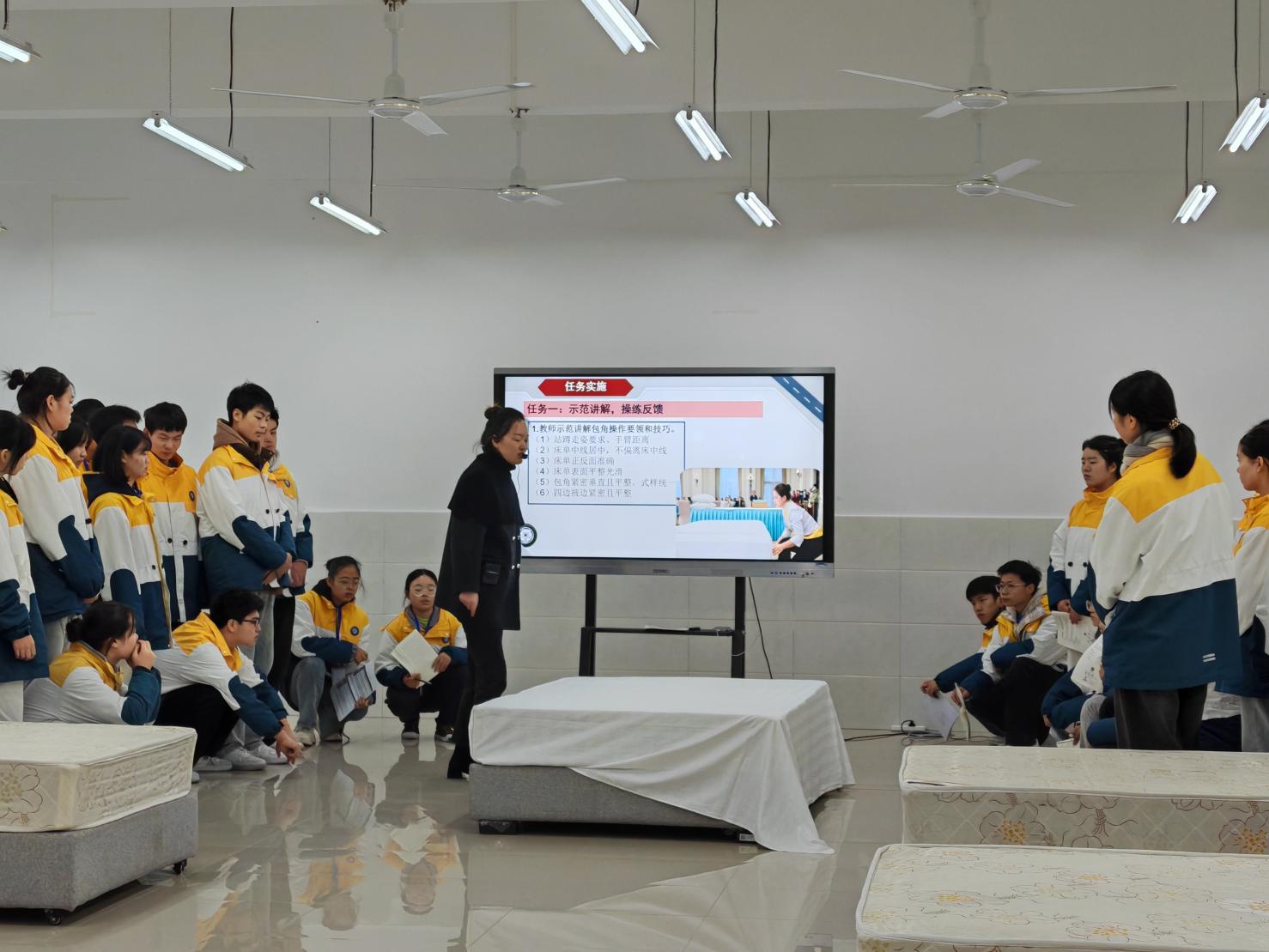 第三节:张欧老师在客房实训室(海棠校区精工楼3楼5306)为师生们带来了《中式铺床-包角》的实训课程。张老师一边示范,一边详细讲解,学生们纷纷动手实践,现场气氛热烈。