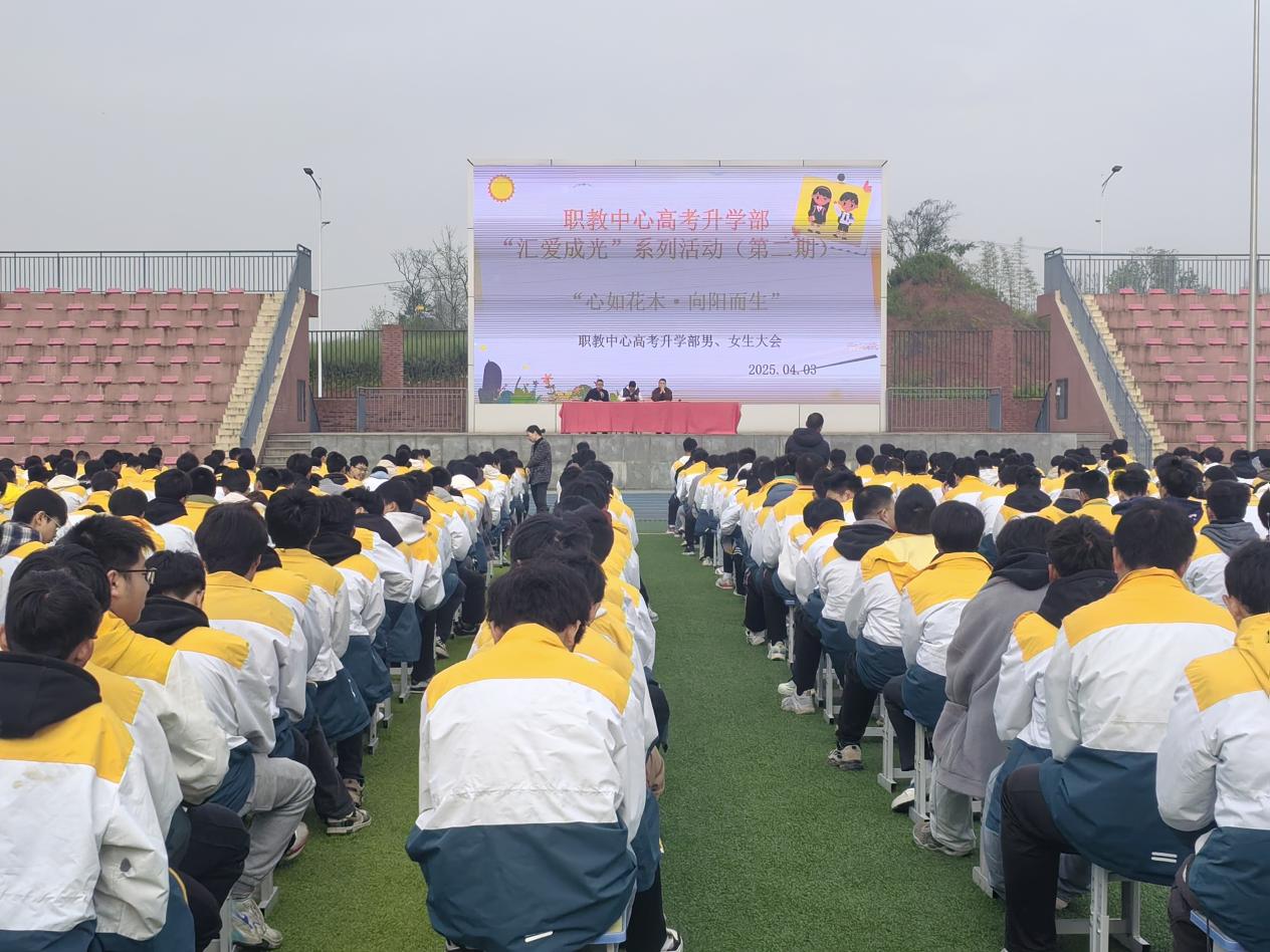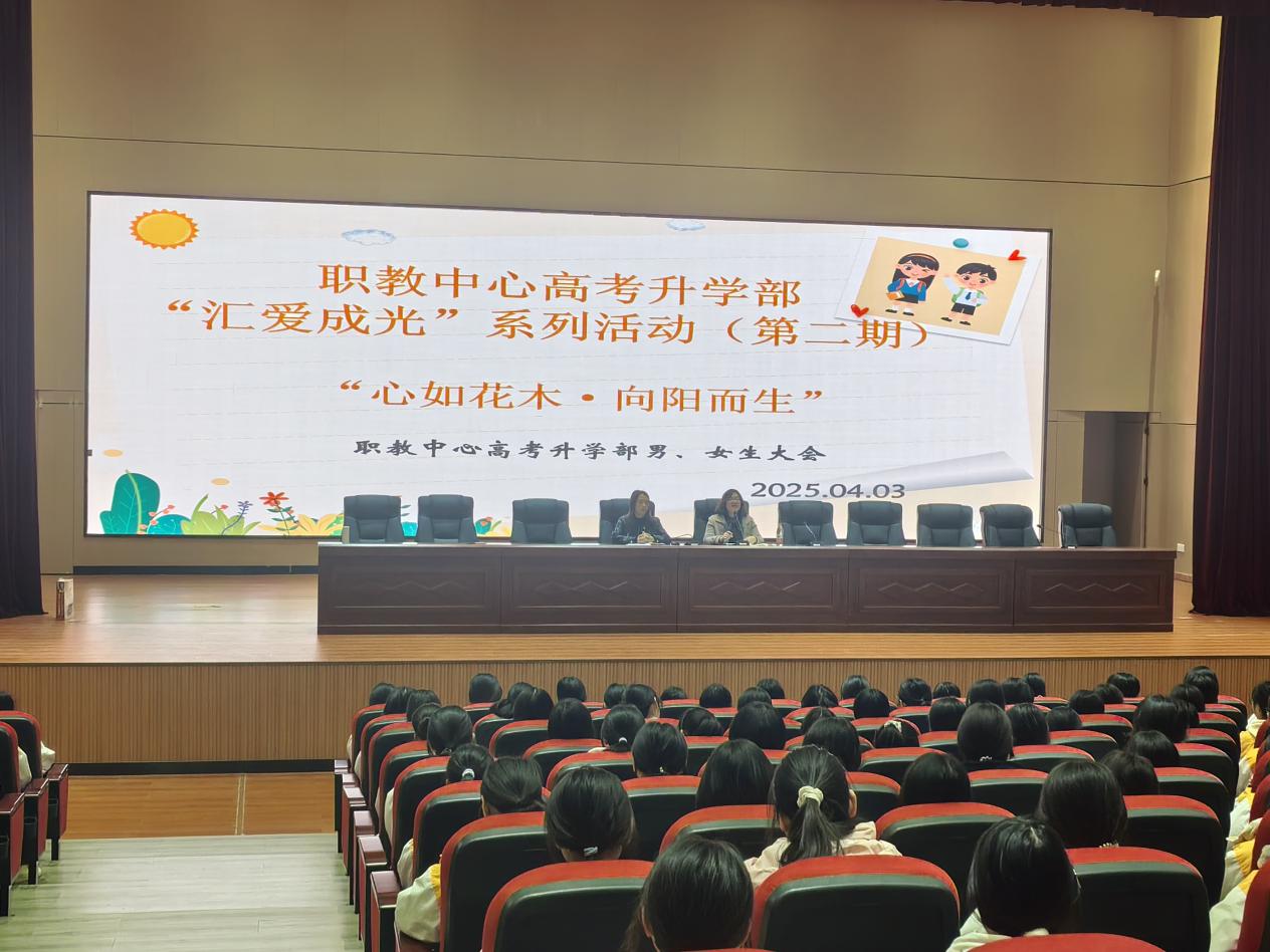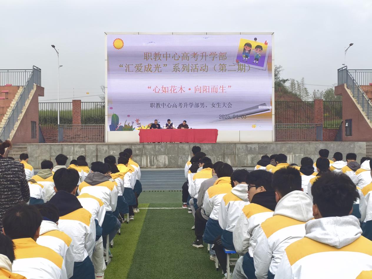 2025年4月3日,职教中心高考升学部“汇爱成光”系列活动的第二期顺利举行。系列活动第二期以“心如花木·向阳而生”为主题在高新校区报告厅和田径场分别召开了男、女生大会。安稳办副主任朱文彬、高考升学部德育专干周正礼、后勤专干夏春莲出席会议。会议由高考部主任钟仕娟、副主任粟廷富分别主持。