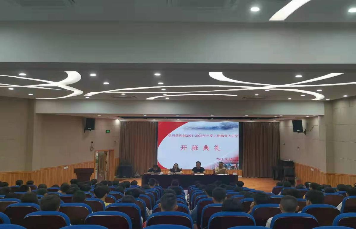 2021年9月15日下午4:00,信息管理部2021-2022上期“精善大课堂”在大足职业教育中心第二阶梯教室正式开班。学生处主任甘雨,督导室主任易廷英,信息管理部部长邹汝全,德育管理员黄俊彪参加开班仪式并做了发言。开班典礼由黄俊彪老师主持。